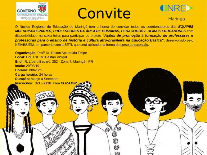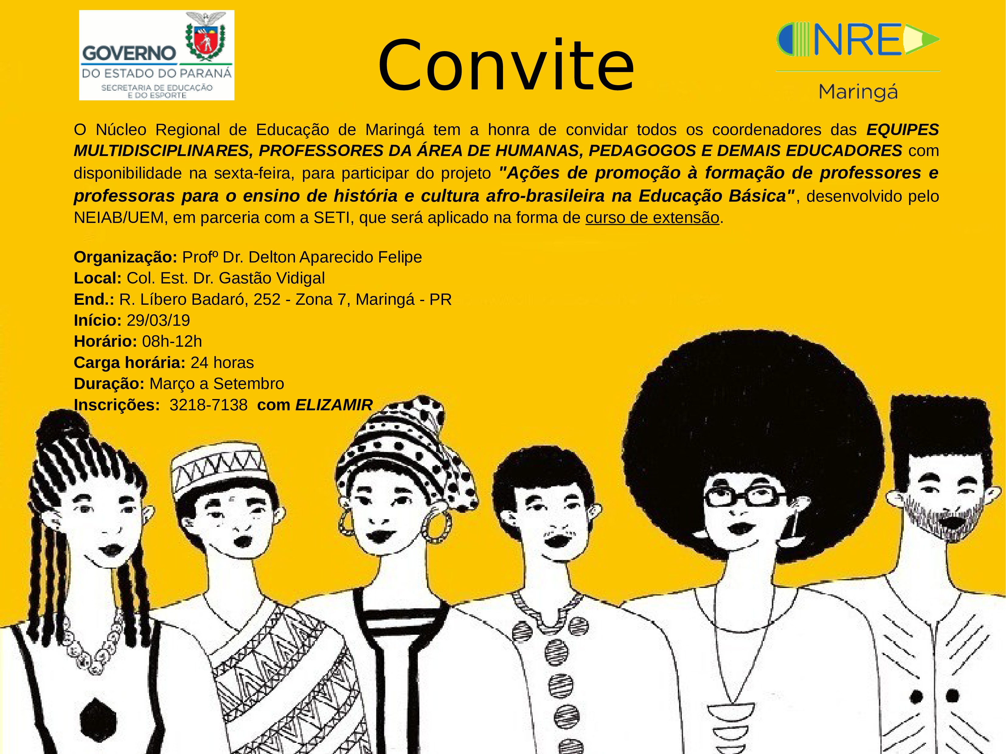 O NEIAB - Núcleo de Estudos Interdisciplinares Afro-brasileiros - UEM, em parceria com a SETI, desenvolveu o projeto "Ações de promoção à formação de professores e professoras para o ensino de história e cultura afro-brasileira na Educação Básica”. O Núcleo Regional de Educação de Maringá aceitou o convite de parceria para esse projeto, o qual, tem como público alvo os coordenadores das Equipes Multidisciplinares de todo NRE, os professores de História, Geografia, Filosofia, Sociologia, Ensino Religioso e Pedagogas da rede estadual de ensino. Serão 06 (seis) encontros com carga total de 24 horas, com início em 29 de março e término em 06 de setembro. Os encontros acontecerão sempre na sexta-feira, no período da manhã no salão nobre do Colégio Estadual Dr. Gastão Vidigal.